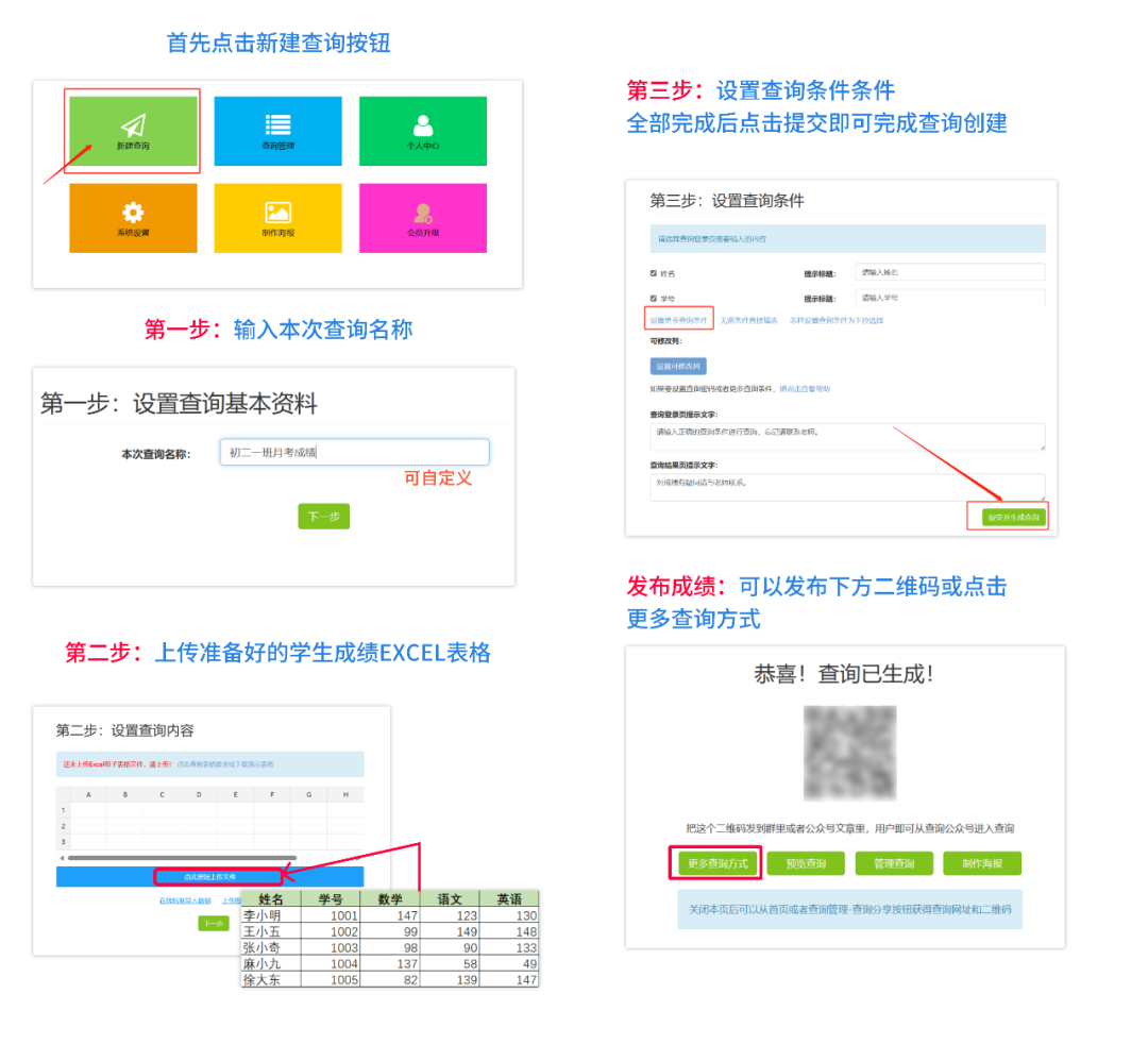 登录后在首页点击新建查询。接着确定查询名称(例如初二一班月考成绩),之后上传电子表格,最好根据自己的需求来设置查询者们的查询条件。